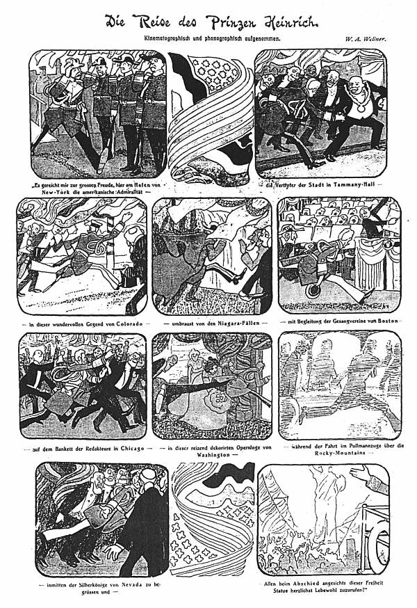Die "Vergnügungsfahrt" des kaiserlichen Bruders in den USA lieferte den 'Lustigen Blättern' auch die Vorgabe für einen Blick auf zahlreiche nationale Stereotypen und Klischees der aufstrebende Nation jenseits des Atlantik, wo die kulturellen und technischen Errungenschaften der 'Moderne' vor allem immer größer und schneller erschienen als zu Hause. Daß das Programm in Zusammenarbeit mit deutschen Stellen zusammengestellt worden war, spielte hierbei keine Rolle.