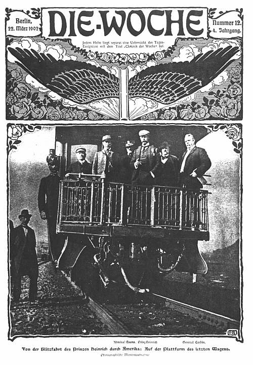 "Das Programm für die "Vergnügungsfahrt" des Prinzen Heinrich durch die "Vereinigten Staaten" ist jetzt festgestellt. Etwas reichlich werden die Genüsse ja werden; aber wer die Gesundheit des Prinzen all das ihm zugedachte Amüsement aushält, dann wird er eine dauernde herrliche Serie von Erinnerungsbildern an diese Lustfahrt mitbringen. Im nachstehenden bringen wir das Programm, wie es der aus 359 Amerikanern bestehende "Vergnügungsausschuss" für den Tag der Reise von Buffalo nach Cleveland festgesetzt.