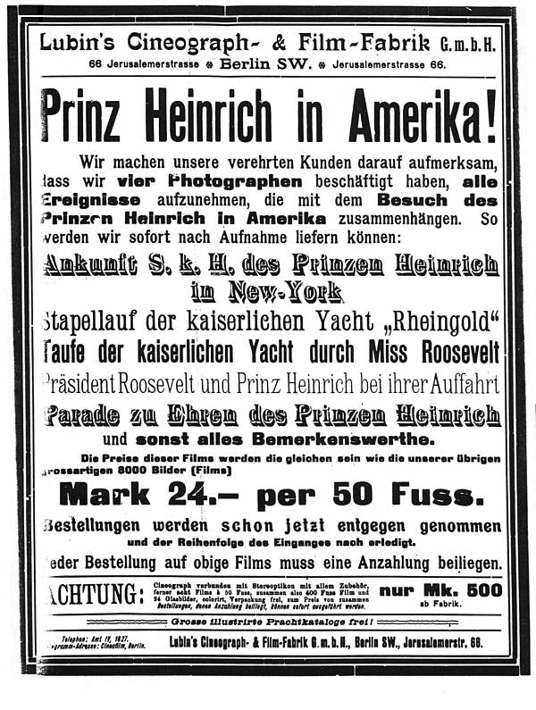 In der ganzseitigen Anzeige, die Lubin geschaltet hatte, wies er unter der fettgedruckten Überschrift: "Prinz Heinrich in Amerika!" auf vier Photographen hin, die er engagiert hatte, "alle Ereignisse aufzunehmen, die mit dem Besuch des Prinzen Heinrich in Amerika zusammenhängen."
